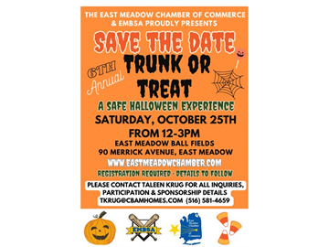 Please note that on October 25, 2025 from 12p to 3pm, the East Meadow Chamber of Commerce and the East Meadow Baseball Softball Association will be hosting it's 6th Annual Trunk or Treat Event at the East Meadow Ball Fields. Please take a moment and register for the event as soon as possible with the Chamber of Commerce website, here's is the link: