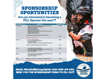 Have you checked out our sponsorship opportunities?! Your sponsorship will greatly benefit the kids of PELL! Contributions go towards equipment, uniforms, field maintenance, umpires and more. It is also a great opportunity to advertise for you business. Email [email protected] for more information!