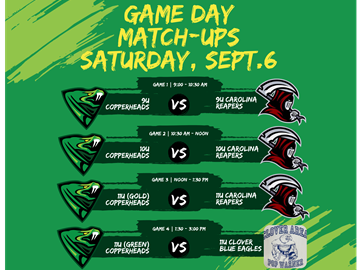 - 9:00 AM: Copperheads 9U vs. Carolina Reapers 9U