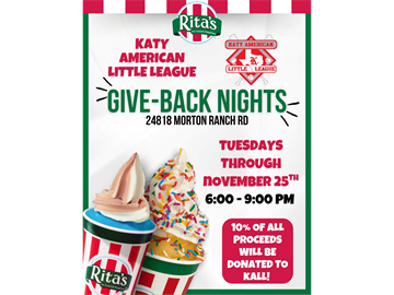Join us every Tuesday thru Nov 25, 2025 at Rita's (right across the street from fields). 10% of proceeds from these Give Back Nights will be given back to Katy American Little league!