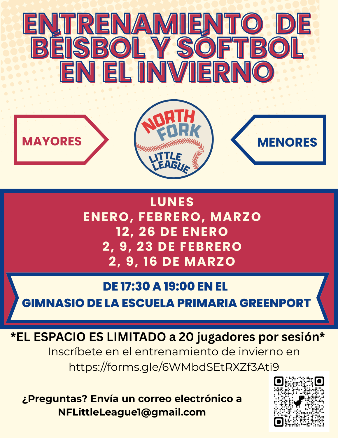 North Fork Little League is holding Winter Training Sessions for Majors and Minors Players Registered for the 2026 SeasonREGISTER FOR WINTER TRAINING AT: https://forms.gle/6WMbdSEtRXZf3Ati9