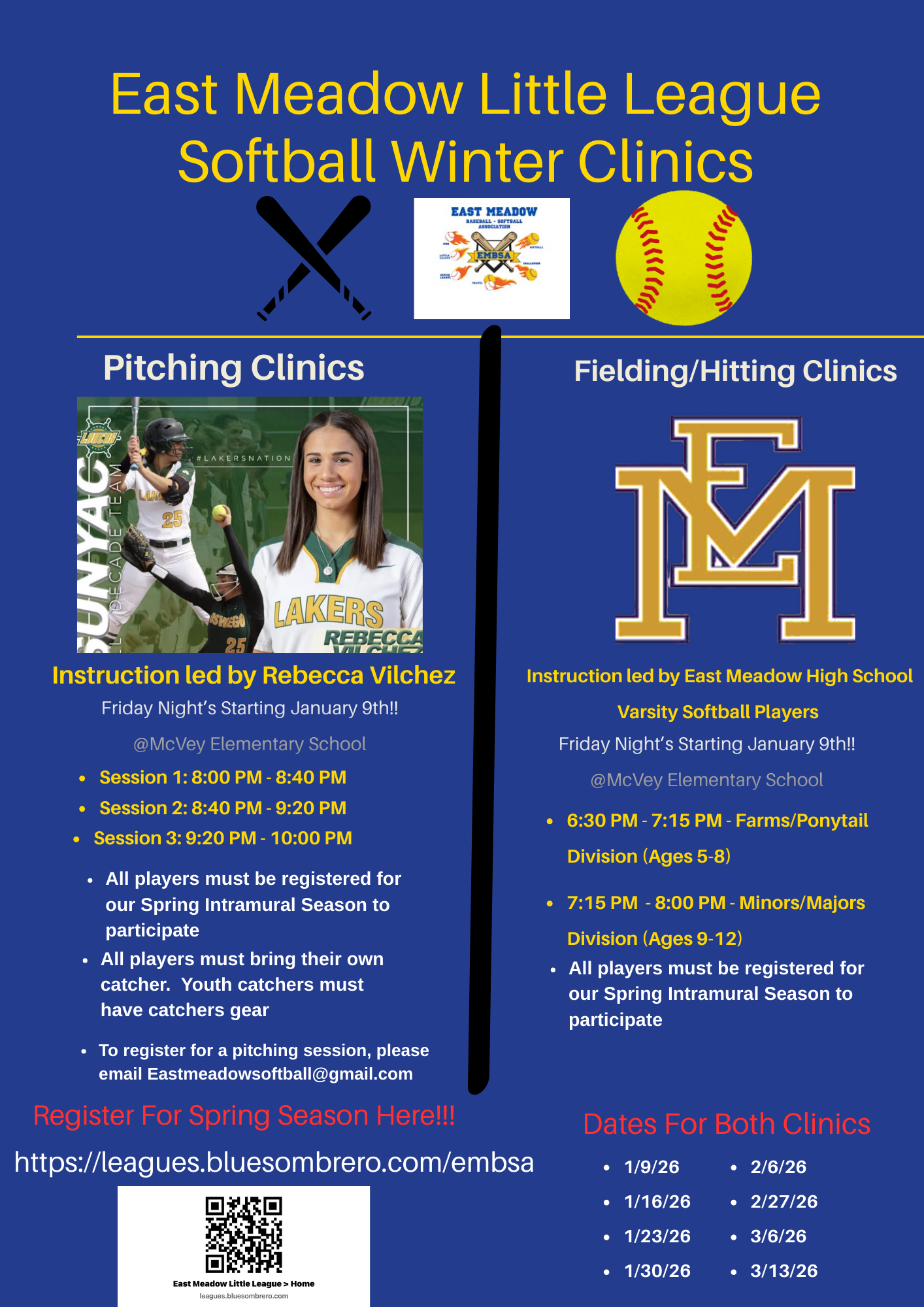 Softball fundamentals will be instructed by East Meadow High School Varsity Softball Players.