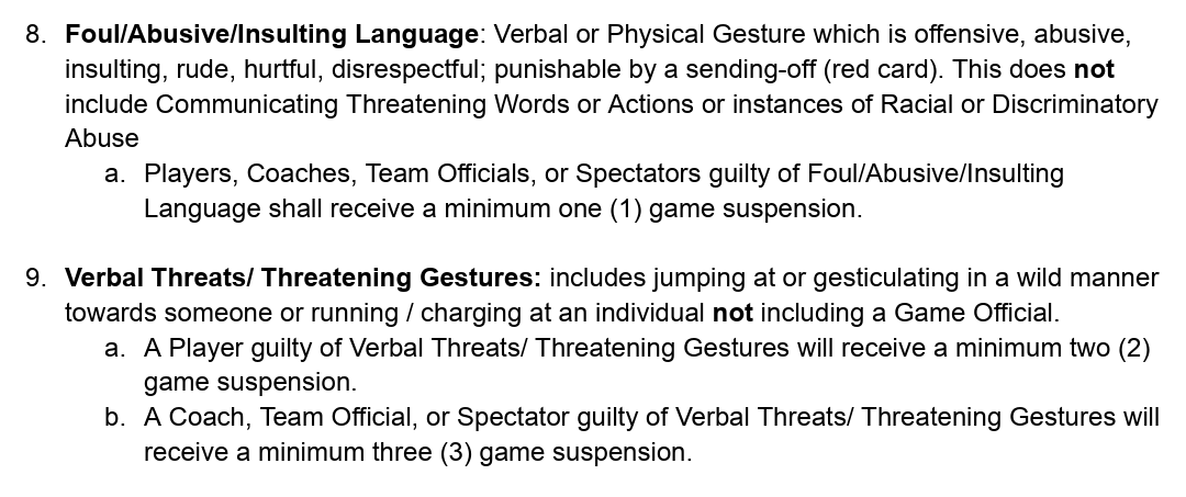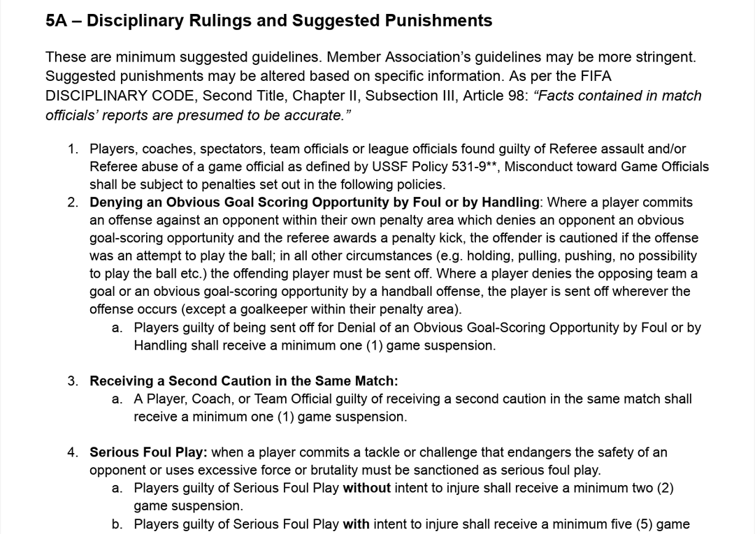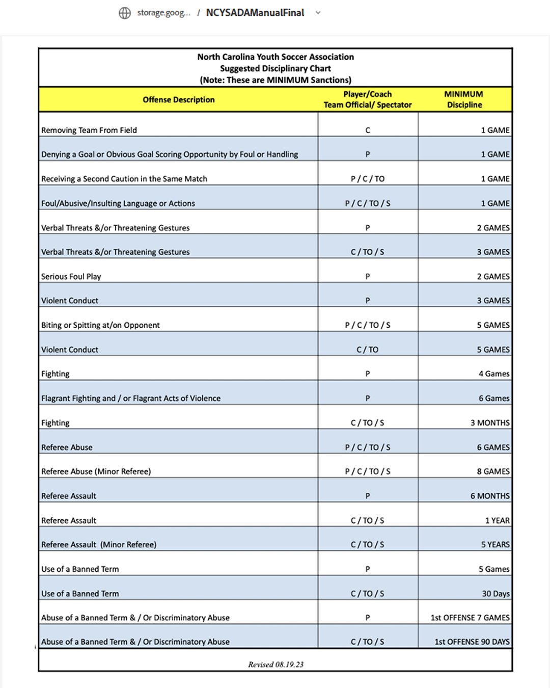 Suggested disciplinary sanctions are determined by the NCYSA Discipline and Appeals Chairman, the NCYSA Discipline and Appeals Manager and/or the Board (see the Chart elsewhere in this Manual). Below are descriptions of suggested MINIMUM sanctions, as well as details of the Send Off Process. A seasonal year is defined as: