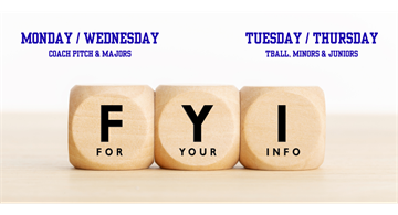 Minors & Up Practices Begin: April 6Coach Pitch Practices Begin: April 20TBall Practices Begin: April 27