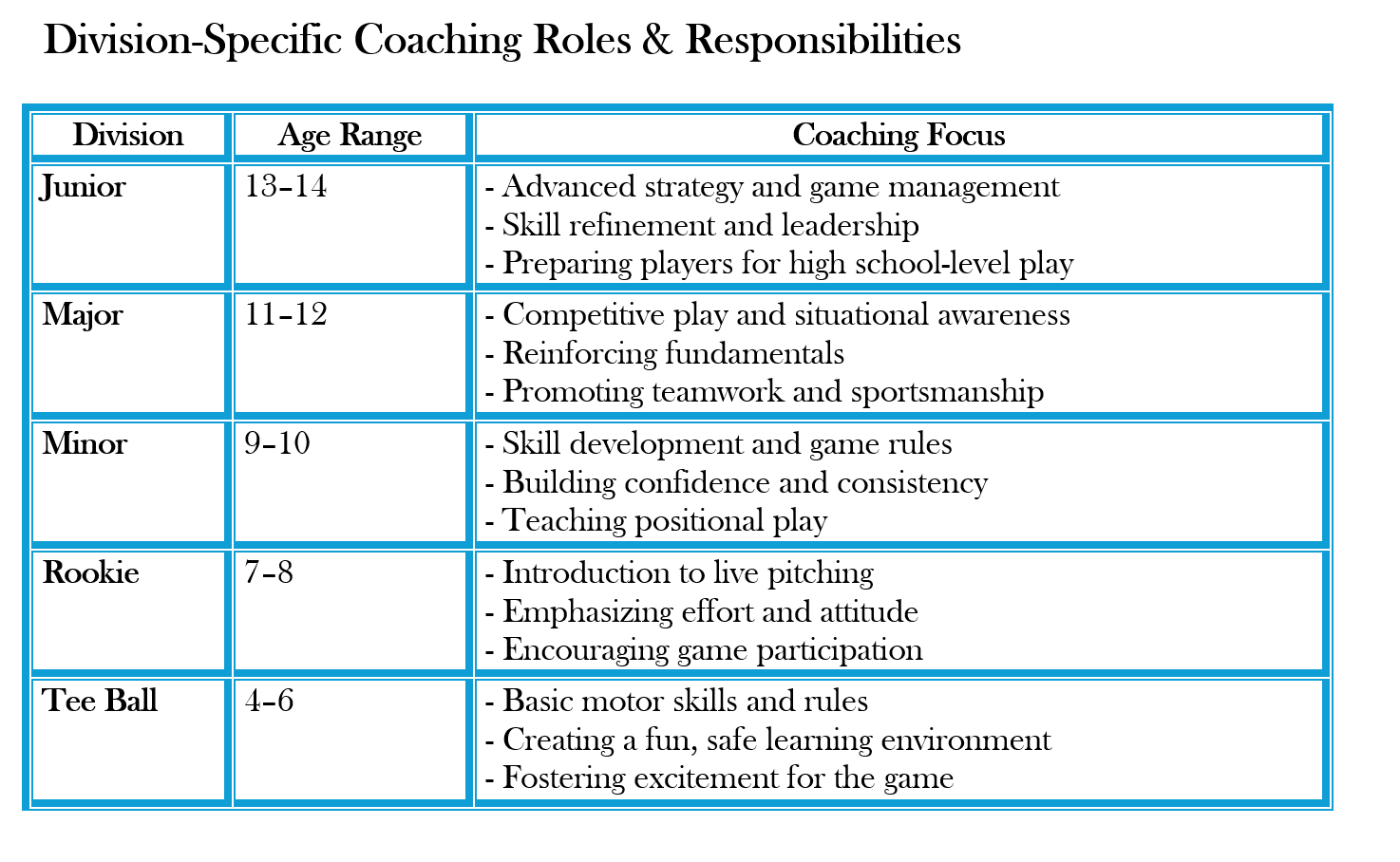 | Coaches are responsible for teaching players fundamental baseball skills such as pitching, hitting, and fielding. Coaches must model and teach good sportsmanship, including respecting rules, opponents, officials, teammates, and themselves. Coaches should foster a positive and supportive team environment, encouraging teamwork and fair play. Coaches are responsible for player safety, including proper warm-up routines, injury prevention, and ensuring players are using appropriate equipment. Coaches should communicate effectively with players, parents, and league officials. Coaches need to be familiar with Little League rules and regulations. Coaches are responsible for bringing necessary equipment to practices and games, such as baseballs, gloves, bats, first-aid kits, and more.