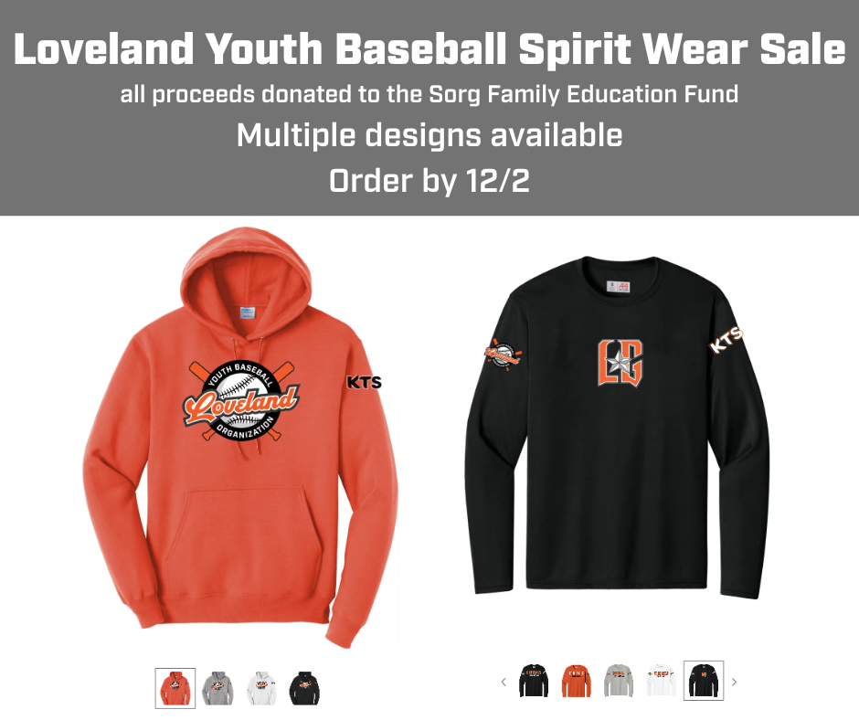 We are currently running a special spirit wear fundraiser for a cause! You can currently purchase spirit wear for Loveland Youth Baseball or the Generals via RP Diamond at the link below with all proceeds benefitting the Sorg Family Education Fund. This sale runs through 12/2/25. After that date stay tuned and check back for future sales. Thank you for your support!