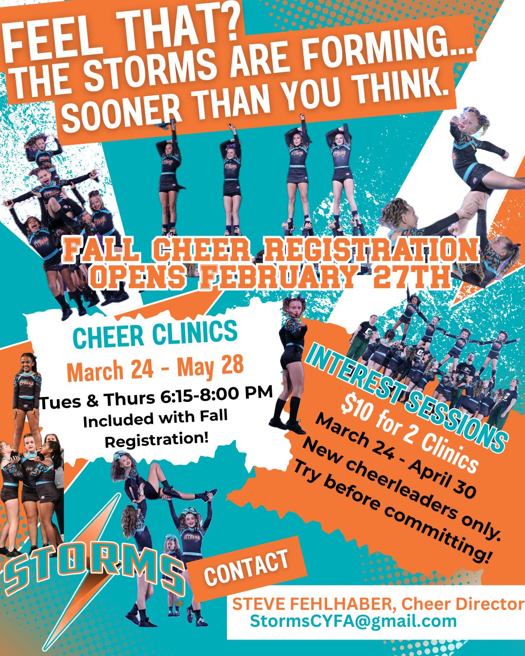 [email protected]Cheer Clinic Information:- If your child has not participated in a cheer program or you are interested in switching to our organization but do not want to fully commit without a trial period we are offering Cheer Clinics beginning Tuesday, March 24th through Thursday, April 30th from 6:15pm until 8:00pm.