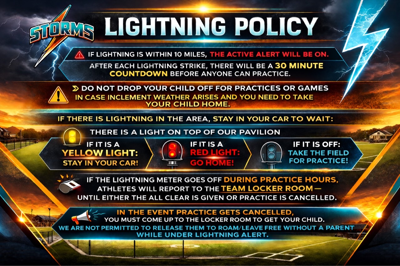If the lightning meter goes off during practice hours, athletes will report to the team locker room until either the all clear is given, or practice is cancelled. In the event that practice gets cancelled, you must come to the locker room to get your child. We are NOT permitted to release them to roam/leave free to the parking lot without a parent while under lightning alert.