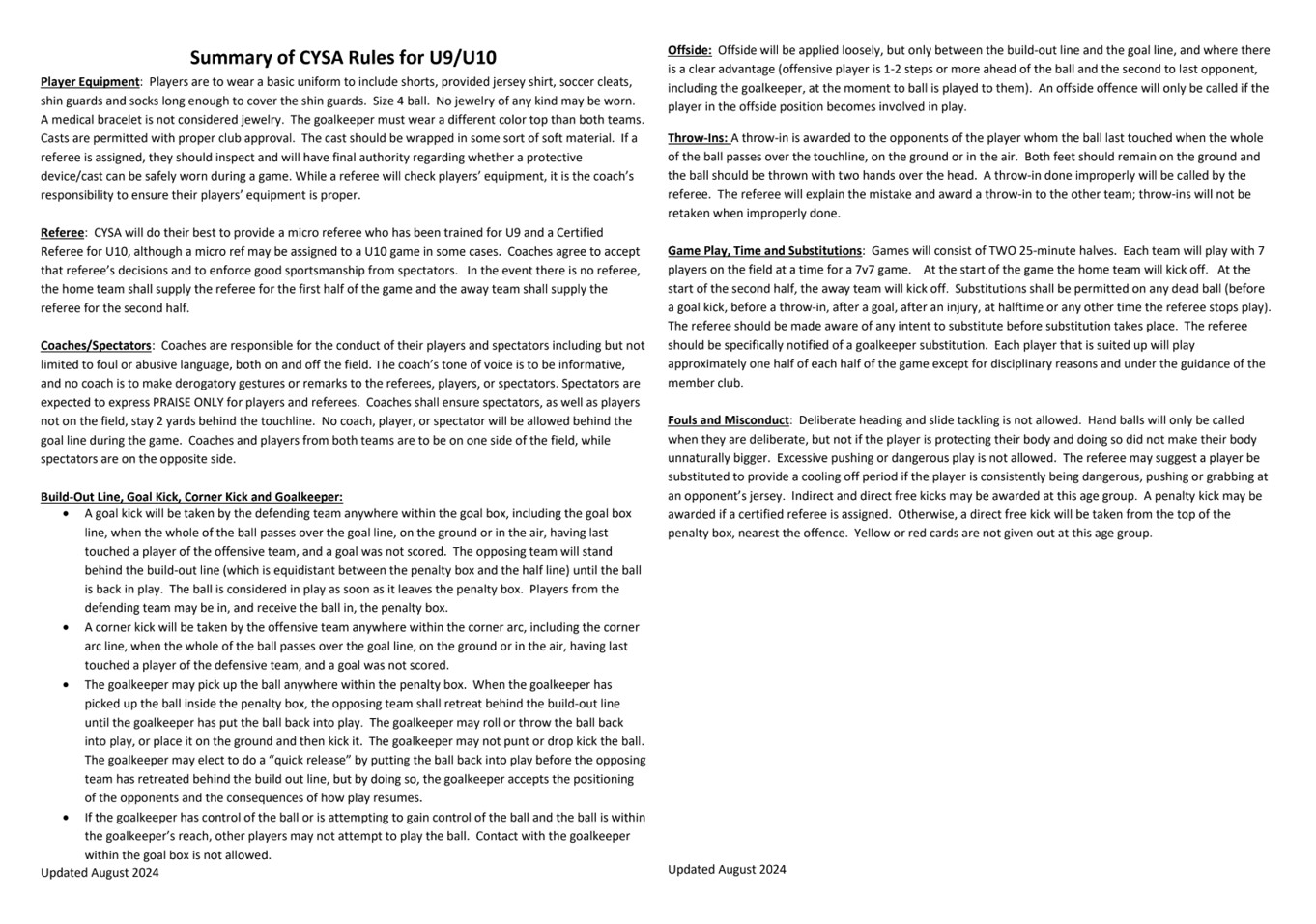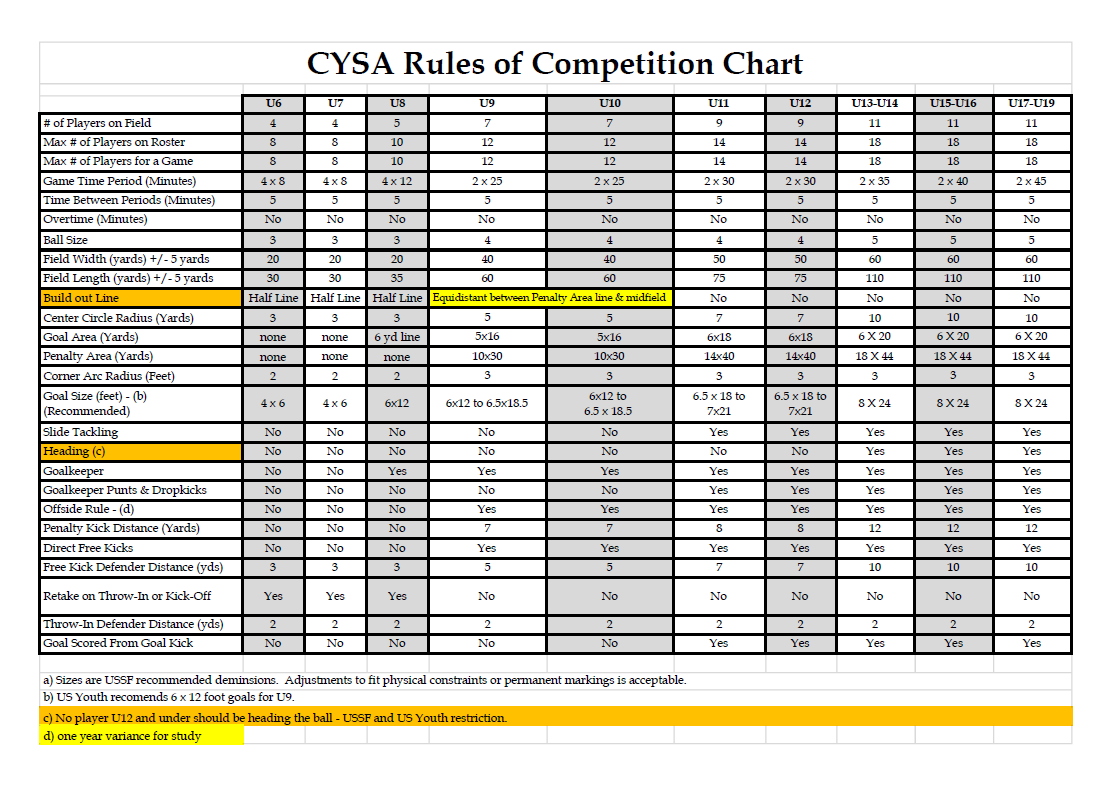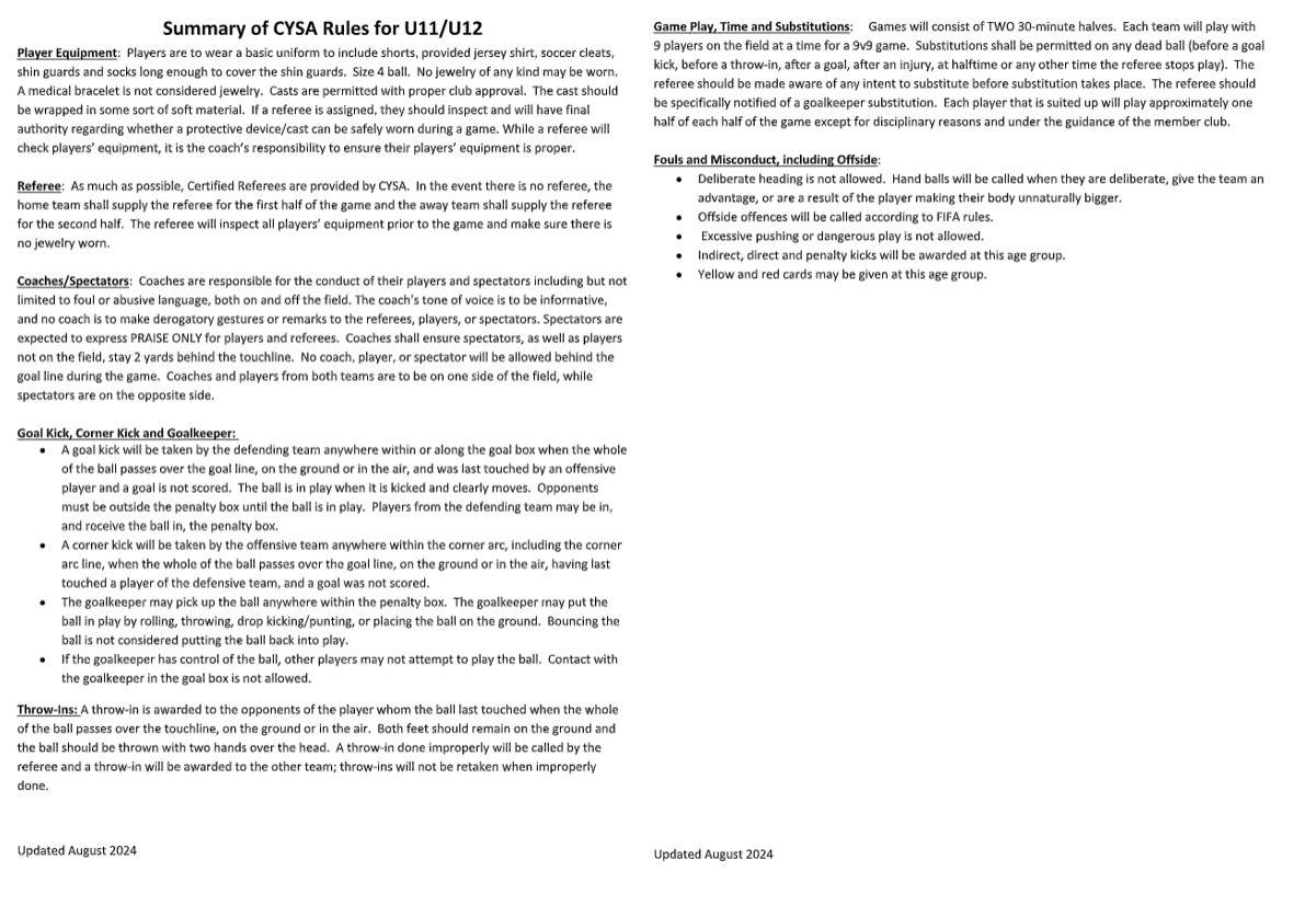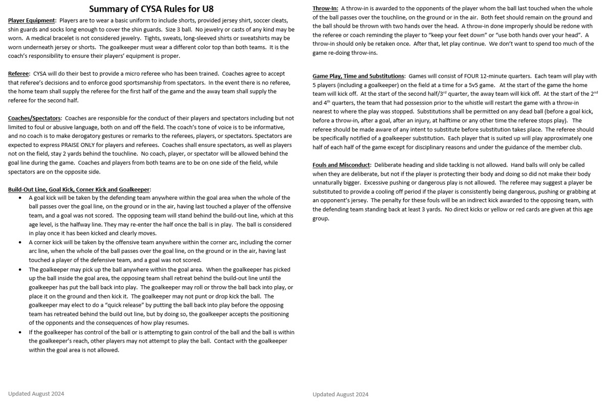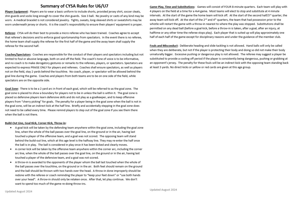 Below are the CYSA Rules and Regulations to follow based on the specific age group you are coaching!