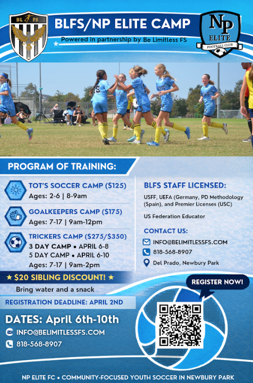 NP Elite FC is excited to partner with Be Limitless FS to bring an incredible Spring Break Soccer Camp to Newbury Park! This week-long camp will focus on skill development, confidence, and fun while training with experienced, licensed coaches.