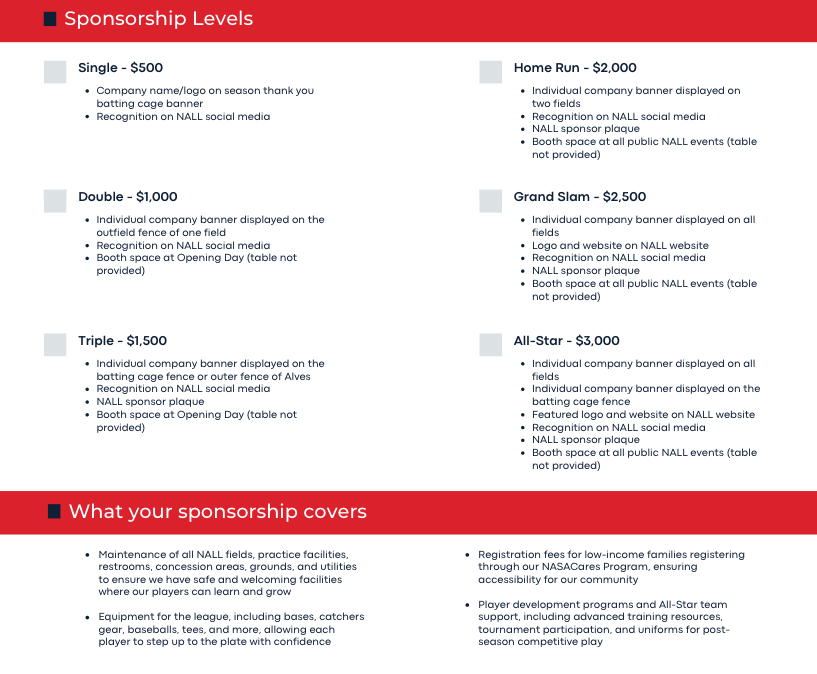 Please consider becoming an Annual Sponsor for NASA Area Little League. In 2026 we will serve over 400 players in the spring season and 300 players during the fall. We have a handful of projects we are looking to take on around the park in the coming years: