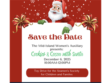 Join us for a fun morning for cookies & cocoa with Santa at Mid Island Little League benefiting the Seamen's Society10AM-12PM