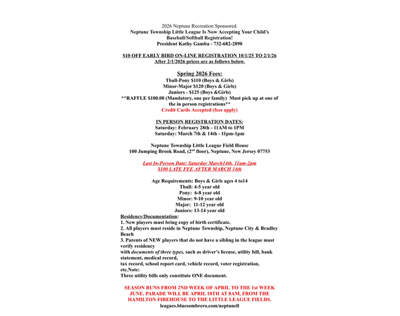 Neptune Little League is a 100% volunteer based non profit organization, serving the local community for nearly 60 years. Our goal is to provide a community based program for children, families, and the community to enjoy the sports of baseball and softball in a way that is engaging, exciting, and fun.